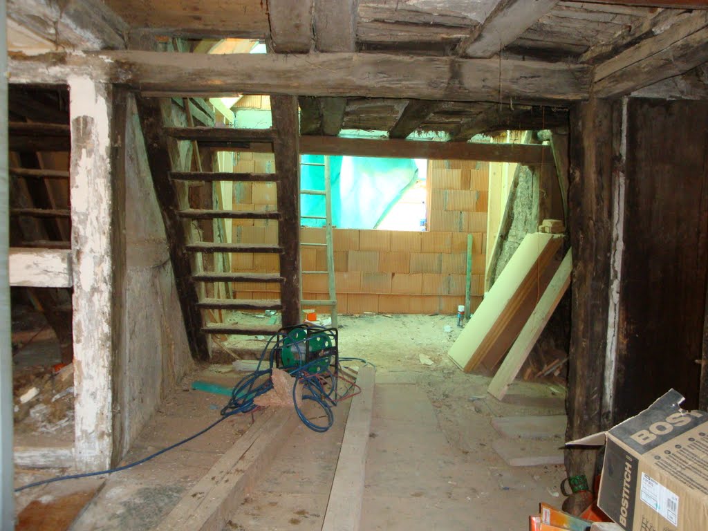 I have to say, Lutz, the carpenter/roofer and his team work like demons. They start at 7am and work till 5pm, at least, and in the past two days I've been away, the back of the house has been transformed. The roof is now watertight, apart from the gable dormer, and is ready for tiles which will come in about 2 weeks. A new roof frame has been built for the gable dormer, and it looks great. The roof windows need to be put in, but that'll just be a matter of cutting holes in the insulation boards. Speaking of which, these boards were a change from the original plan, and I'm pretty happy with the suggestion from Lutz. 35mm thick, wood-based insulation boards which are breathable, give an initial layer of insulation and sound-proofing, and they are environmentally friendly. They'll eventually be backed up with cellulose insulation to keep us snug.